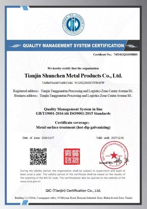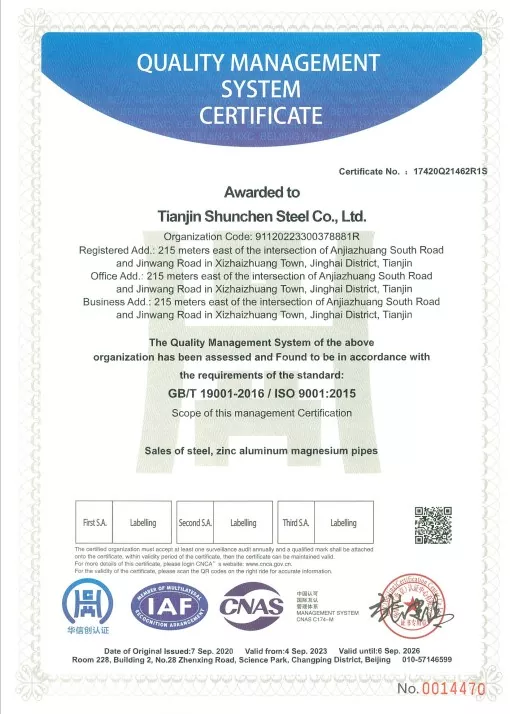 Стандарты: GB/T 3091-2015 «Сварные стальные трубы для транспортировки жидкостей под низким давлением», GB/T 13912-2020 «Стальные трубы, оцинкованные горячим погружением». Продукт прошел стороннее тестирование и имеет протокол испытаний.