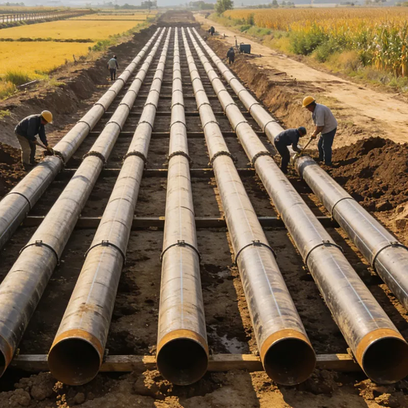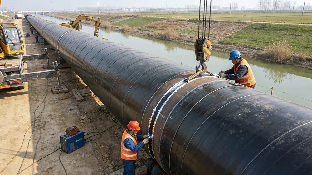 Применимые сценарии: крупномасштабные проекты водозабора, проекты переброски воды, проекты борьбы с наводнениями и дренажа, магистральные трубопроводы для орошения сельскохозяйственных угодий, проекты водоснабжения для питьевой воды, проекты водоснабжения островов и т. д. Основными требованиями являются высокая пропускная способность, коррозионная стойкость и устойчивость к давлению воды. Их можно адаптировать к сложным условиям, таким как русла рек, засоленные земли и т. д. Они могут эффективно противостоять водной эрозии и геологическому проседанию, обеспечивая стабильную передачу водных ресурсов и гарантируя безопасную эксплуатацию проектов водного хозяйства. Они играют важную вспомогательную роль в ключевых национальных проектах по охране водных ресурсов. Описание места происшествия: На строительной площадке Цинхайского водозаборного проекта для прокладки магистральных трубопроводов используются спиральные трубы большого диаметра. Трубы проходят через реки или сельскохозяйственные угодья, и рабочие выполняют герметизацию границ раздела. На объекте водоснабжения острова используются спиральные трубы большого диаметра с антикоррозионной технологией 3PE для предотвращения эрозии морской воды и обеспечения связи водных ресурсов между островом и материком.