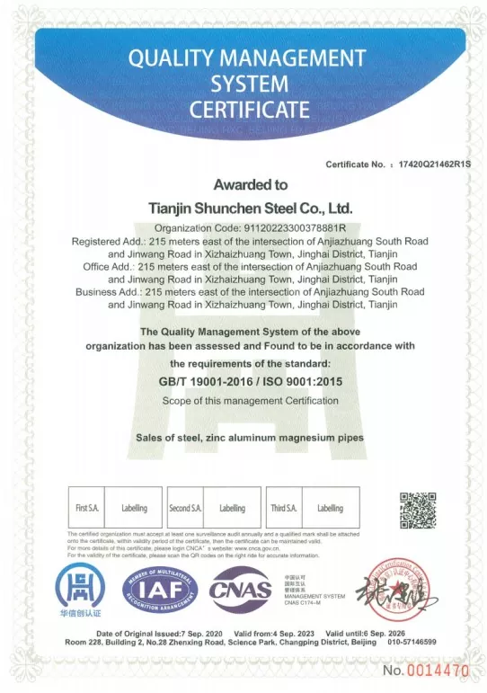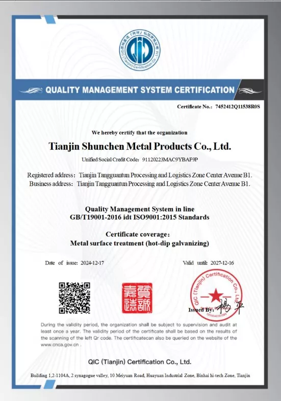 Стальная U-образная секция компании Shunchen Industrial получила сертификат качества ISO9001, соответствующий национальным стандартам. Мы предоставляем сторонние отчеты об испытаниях материалов и сертификаты толщины цинкования. В нашем производстве используются передовые производственные линии, проходящие 12 строгих технологических этапов, подкрепленные более чем 20-летним производственным опытом. На протяжении 12 лет мы фиксируем отсутствие нарушений контрактов и отсутствие ежегодных инцидентов, связанных с качеством. В процессе производства применяются три пассивационные обработки для повышения антищелочной устойчивости оцинкованных изделий. Каждый готовый продукт проходит сушку, проверку и отделку перед упаковкой и отправкой. Компания имеет сертификаты системы ISO 9000, 3A и сертификат CE ЕС. Благодаря нашим 12 этапам процесса и трехуровневому комплексному механизму проверки мы добились отсутствия ежегодных инцидентов, связанных с качеством и безопасностью, и в течение 12 лет поддерживали нулевой уровень нарушений контрактов.