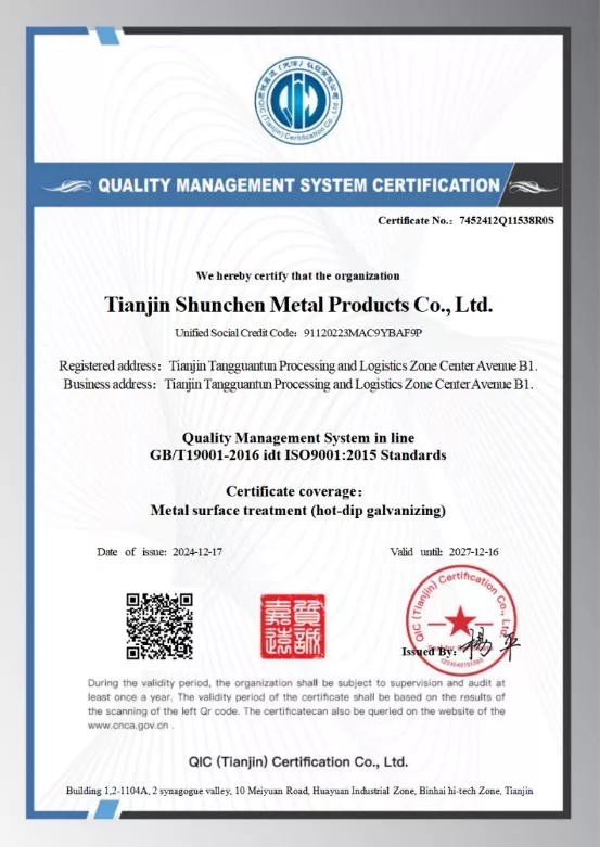 Выбирайте Shunchen для надежного качества. Мы используем высококачественную сталь Q235B или Q355B, обработанную горячим цинкованием для обеспечения устойчивости к коррозии. Температура цинковой ванны точно контролируется в диапазоне 450-460 градусов Цельсия, чтобы обеспечить прочное сцепление цинкового покрытия и отсутствие пропущенных участков. Наша продукция соответствует сертификации системы качества ISO9001 и подтверждается отчетами о проверке цинкового покрытия третьих сторон.